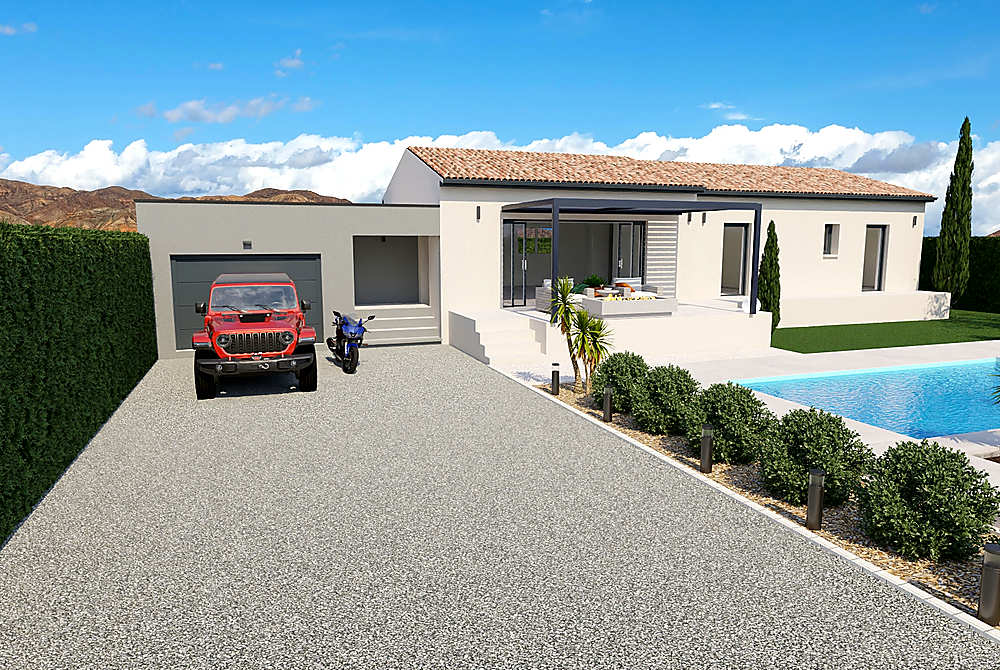 Cette maison de plain pied modulable est composée de 3 chambres, cuisine ouverte sur une grande pièce de vie très lumineuse, salle de bains et WC indépendant, garage en option.